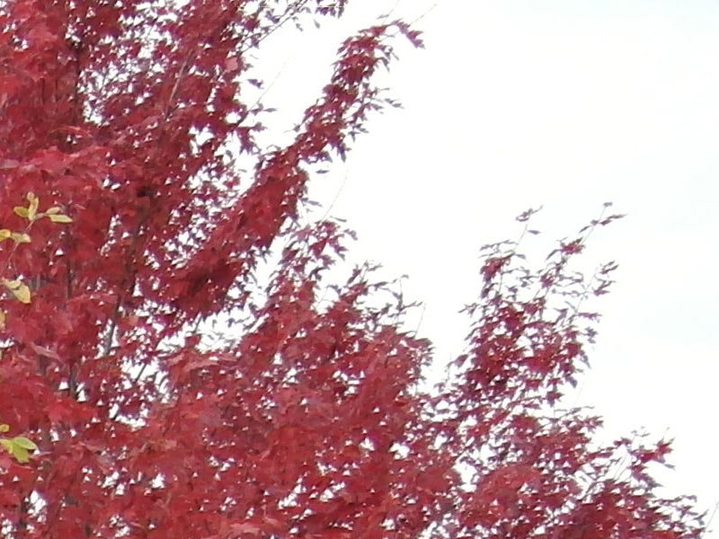 CA is negligible to non-existent in most everyday shots and even in very high contrast shots using the 18-55mm kit lens. The area delimited by the red square at top right, and reproduced at 100% crop at bottom right, shows no purple fringing.