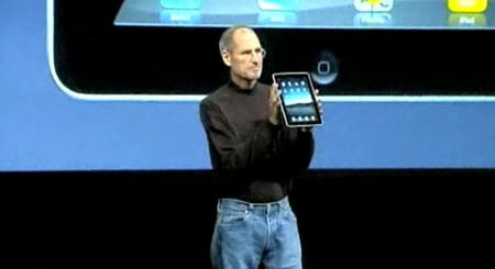 Steve Jobs unveiled the Apple iPad [“last time there was this much excitement about a tablet, it had some commandments written on it [referring to the 10 Commandments written on 2 tablets of stone]” today at the Yerba Buena Center in San Francisco.