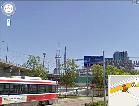 Google Street View Maps became available this month in Toronto, Ontario, Canada — and already embarrasing glitches are showing up, such as twin CN Towers. The surprising thing is not that an amateurish photo editing mistake was made [bad enough where Toronto’s landmark is concerned], but that after this error was reported all over Toronto news all day, it’s still there for all to see… just a little nudging is all that is needed to fix it.