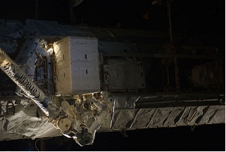 Image of extravehicular activities on the STS-131 mission. View of astronauts, as they work to tie down an Ammonia Tank Assembly on the International Space Station during STS-131 spacewalk.