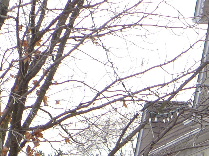 CA is under control in everyday shots and is minimal even in very high contrast shots. The corner delimited by the red square at top left, and reproduced at 100% crop at bottom right, shows minimal purple fringing.